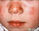 Esta es una fotografía de una erupción por lupus eritematoso sistémico en el rostro. A menudo, el lupus eritematoso ocasiona una erupción en forma de mariposa o malar. Por lo general, esta erupción también se presenta en la nariz.